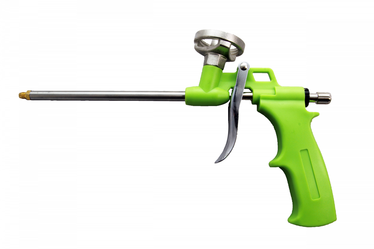 Универсальный металлический адаптер с хромированным покрытием подходит для большинства разновидностей баллонов, а отверстия в его нижней части делают процесс очистки от монтажной пены простым и быстрым.