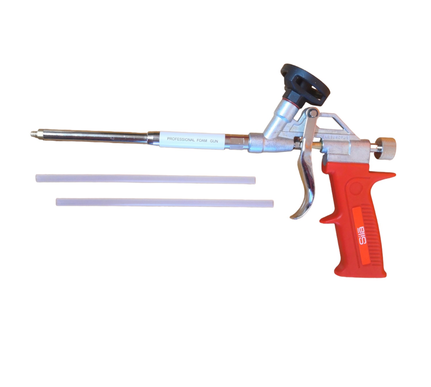 Пистолет имеет стандартные размеры и подходит к большинству профессиональных монтажных пен. Для более глубоких проёмов и трещин есть 2 специальные насадки для работы в труднодоступных местах.