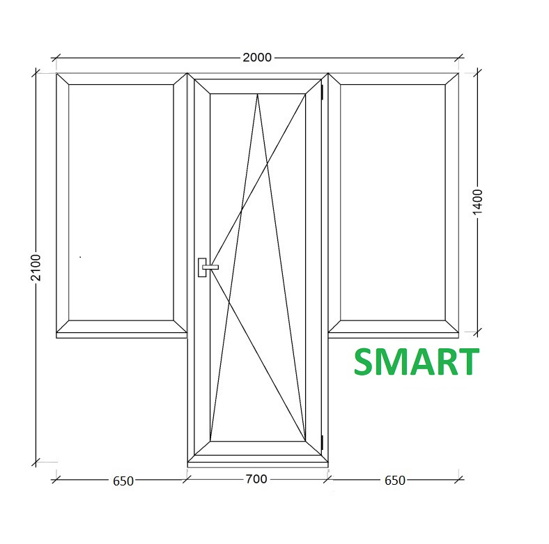 Пластиковая дверь ПВХ балконная 2000*2100 с глухими боковыми окнами (Smart Energy 3кам)